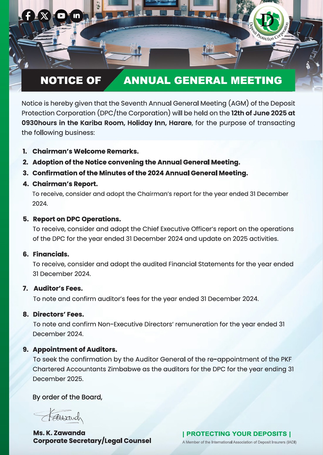 Notice is hereby given that the Seventh Annual General Meeting (AGM) of the Deposit Protection Corporation (DPC/the Corporation) will be held on the 12th of June 2025 at 0930hours in the Kariba Room, Holiday Inn, Harare. For more information, click the link below to view the AGM notice: